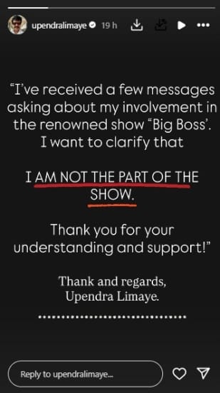 मात्र, या चर्चांवर स्वतः उपेंद्र लिमये यांनीच पडदा टाकला. त्यांनी इन्स्टाग्राम स्टोरीवर एक पोस्ट शेअर केली. या पोस्टमध्ये ते म्हणतात – “‘Bigg Boss’ या लोकप्रिय शोचा मी भाग आहे का, अशी अनेकांची विचारणा होत आहे. मी स्पष्ट सांगू इच्छितो की, मी या शोचा भाग नाही. तुमच्या पाठिंब्यासाठी मनापासून धन्यवाद.” त्यांच्या या थेट उत्तराने सर्व शंकांना पूर्णविराम मिळाला.