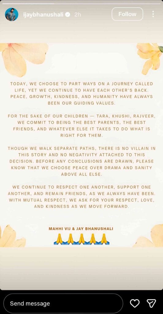 घटस्फोटाची प्रक्रिया काही महिन्यांपूर्वीच सुरू झाली होती आणि त्यानंतर दोघे स्वतंत्र राहू लागले. तरीही, जय भानुशाली आणि माही विज यांनी या निर्णयात कोणतीही नकारात्मकता जोडली नाही, आणि प्रेक्षकांनाही त्यांनी विनंती केली की, त्यांच्या वैयक्तिक निर्णयाबाबत निष्कर्ष काढताना शांतता आणि सामंजस्याला महत्त्व द्यावे.