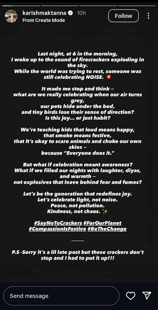 Karishma Tanna हिनं या पोस्टद्वारे लोकांना विचार करायला भाग पाडलं आहे. तिनं आपल्या चाहत्यांना आवाहन केलं की, “आपण अशी पिढी बनवूया जी सण म्हणजे प्रकाश आणि शांततेचा उत्सव समजते, प्रदूषणाचा नव्हे.” तिनं #SayNoToCrackers, #BeTheChange, आणि #ForOurPlanet हे हॅशटॅग वापरत पर्यावरण संरक्षणाचा मजबूत संदेश दिला.