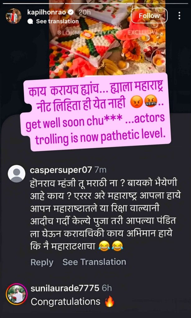 ही टीका पाहताच कपिल होनरावचा संयम सुटला. त्या नेटकऱ्याचा कमेंटचा स्क्रीनशॉट शेअर करून त्याने थेट खुल्या शब्दांत उत्तर दिलं. “लोकांना स्वतःच्या भाषेचा स्पेलिंगही नीट येत नाही आणि मराठीपणाचा बाणा मिरवतात. आपल्या वैयक्तिक आयुष्यावर अशा पातळीवर बोलणं म्हणजे संस्कारांचा अभावच,” अशा आशयाचे शब्द वापरत त्याने ट्रोलर्सना खरमरीत उत्तर दिलं. त्याने पुढे सांगितलं की, आदर, प्रेम आणि परिवार या गोष्टी व्यक्तीच्या मनात असतात, जात, भाषा किंवा राज्यावरून कोणाचं व्यक्तिमत्त्व ठरत नाही.