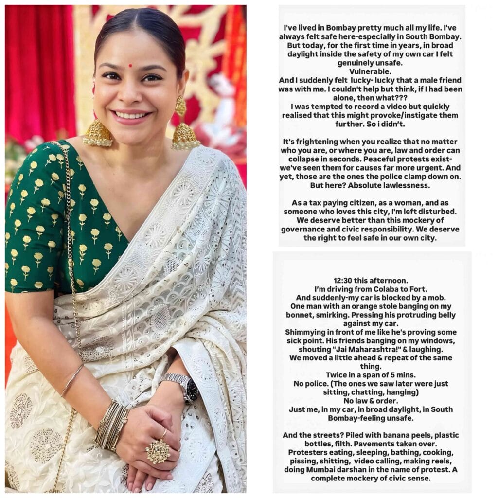 Sumona Chakravarti ने इन्स्टाग्रामवर एक विस्तृत पोस्ट लिहिताना सांगितलं की, दुपारी साडेबारा वाजताच्या सुमारास ती कुलाबाहून फोर्टकडे जात असताना अचानक आंदोलकांच्या मोठ्या गर्दीने तिच्या कारला अडवले. भगवा गमछा घातलेल्या एका व्यक्तीने कारच्या बोनेटवर हात आपटत विचित्र हालचाली केल्या. इतकंच नव्हे तर तो हसत-खिदळत तिच्या गाडीच्या अगदी समोर उभा राहिला. त्याच्यासोबत इतर काही जण कारच्या आरश्याजवळ येऊन “जय महाराष्ट्र” अशा आरोळ्या देत होते.
